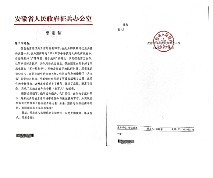 近日,安徽省人民政府征兵办公室向法学院2023级法学1班陈玉洁同学发来感谢信,对其在2025年下半年预定女兵役前教育中的突出贡献给予充分肯定并表示诚挚谢意。